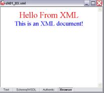 Source Document: ch01_02.xml <?xml version="1.0" encoding="UTF-8"?> <document> <heading> Hello From XML </heading> <message> This is an XML