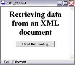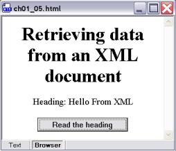 Retrieving data from an XML document </H1> <DIV ID="message"></DIV> <P> <INPUT TYPE="BUTTON" VALUE="Read the heading" ONCLICK="getData()"> </CENTER> </BODY> </HTML> |