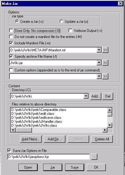 Manifest-Version: 1.0 Main-Class: jwiki.JWiki Created-By: CodeWarrior Java LinkerIn the second line of the above, replace jwiki.JWiki with the name of your main class, prefixed with any package that it is in. In this example the package is jwiki and the main class is JWiki. Note that it is case sensitive. The contents of the Created-By clause can be most anything I'd guess.