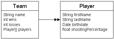 The Player object (with source code) follows the same conventions as the Team object, except there are three read-only attributes: firstName, lastName, and birthdate. Again, you can only set these attributes when you are creating the object. The last attribute, shootingPercentage, can be changed throughout the lifetime of the object.One special note about the Date class. It seems that it can't represent a date that occurred before 1970. This sucks. Since this is just an example, I've just made all the players 10 years younger than they actually are, but this obviously won't work for real business applications. | The Smalltalk code for the Player object is found in Player.st. | |