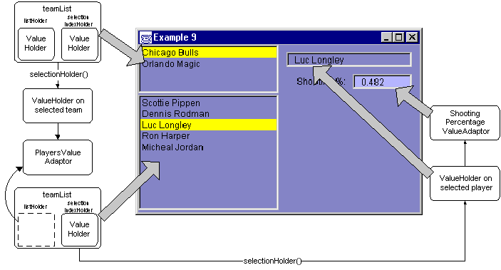 | This example is very similar to the last one, but we will tie everything together. In addition to having a list for the players, we'll add another list for the teams. When you select a team, the list of players will update. When a player is selected, the detail view on the right is updated. You may want to check out a diagram of this example, which may help you understand the source code. | The Smalltalk version of this example can be found in Example9.st and can be started by evaluating "Example9 open". | |