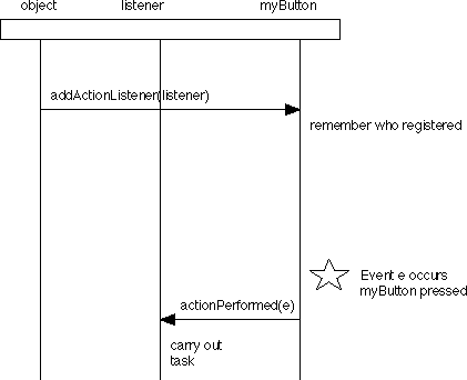 Later, when the event occurs, the button informs the listeners (there may be several) that the event occured by sending the actionPerformed message to each of the listeners. This is also done automatically by Java library code. To be a listener you must have such a message implemented, of course. It is in this method that the listener carries out the task that is supposed to be done when the event occurs.