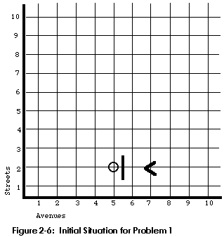 From this definition we see that a robot executes a move instruction by moving forward to the next corner. However, the robot performs an error shutoff when its front is blocked. Both situations are illustrated in Figure 2-1. Figure 2-1 shows the successful execution of a move instruction. The wall section is more than one half-block away and cannot block this robot's move.