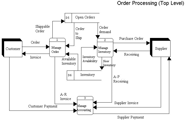 I will use this page to explain the above code. It doesn't use any Java advanced features, such as thread and internet programming, but it is relatively sophisticated code. Feel free to add to the discussion or to ask questions. You can also ask me to develop some topic in Java. The code represents the starting point of a software engineering project to develop an Order Processing system. It is a partial solution to a problem whose requirements are expressed in the following high level data flow diagram.