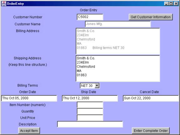 From the Kawa toolbar, click on Run Java which should bring up the OrderEntry form. Enter customer number “C5002” which should bring up the customer information as shown below. This part works so close the OrderEntry form.