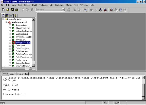 Now right click on InvoiceTest.java and click on Main Class which puts a red box around that module indicating that it contains the main class to run. From the toolbar, click on Run Java to get the message “OK (2 tests)” as shown below