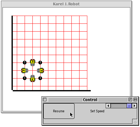 The simplest kind of robot is an ur_Robot (built-in -- UrRobot in Karel J Robot) that can move, turn-off, and turn left, pick up and put down beepers. It will automatically (error) halt if it tries to move through a wall or pick up a beeper when there is none available on its corner or tries to put one down when it possesses none. The first three chapters of the book work only with ur_Robots.