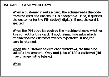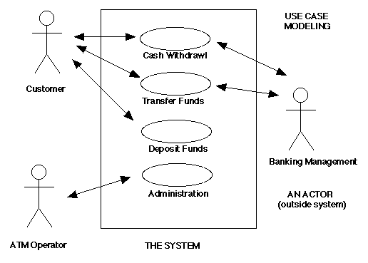 Use Case modeling examines the system from the viewpoint of a single user interacting with the proposed system in a single way. The prototypical use case is performing a cash withdrawal from an ATM. The next figure illustrates six different use cases performed by three different external actors on the ATM system.