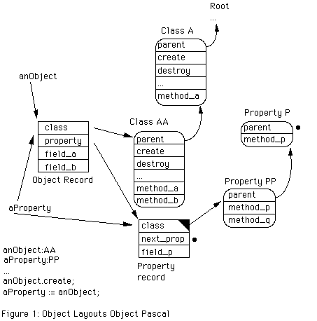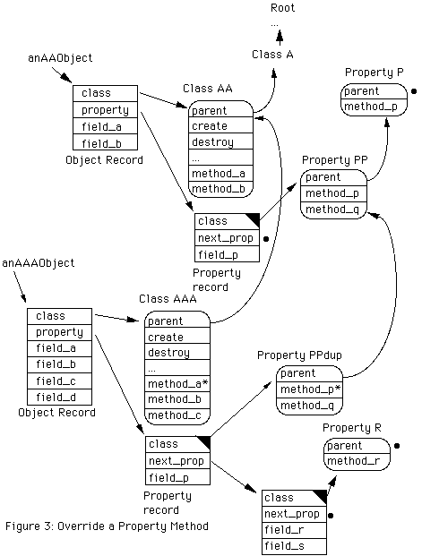 In figure 3 we show both a reference to an object of type AA and to one of type AAA. Note that the class-record for class PP has to be duplicated in the run-time system to be able to hold a pointer to the new method body. Again, the knowledge that this must be done resides in the compiler, and is discovered when the override of a property method appears in the class declaration of AAA. This new class-record does not represent a new property class, but only a segment of a new concrete class. However, the duplicated PP record points to the original PP record as if it were its parent. This is required for type inquiry, when the program tests if anAAAObject IS PP.