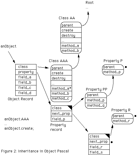 The (concrete) reference variable anObject is represented by a pointer variable to the first object-record. Since the compiler has knowledge of the layout, it knows that field_a is at a certain offset in that first segment and that field_p, which was inherited from property class P is in some fixed offset in the second segment. Likewise the compiler knows that a pointer to code for method_a may be found by following a pointer to the class record and then applying a fixed offset and that for method_q may be found by a similar computation from the second object-record.