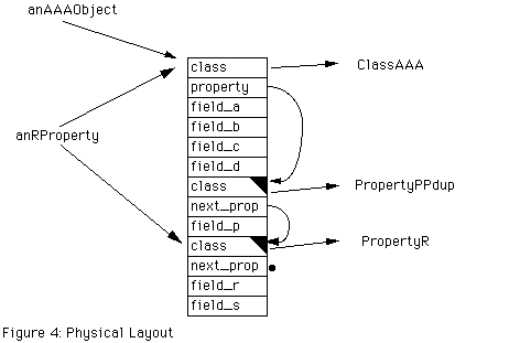 As we see, the layouts implied by this have new fields in the first segment, a new method in the class-record, and a replacement (indicated by *) in the method_a slot in that class-record. Likewise, a new property segment is required in the object-record chain. This segment contains the instance variables declared in the new property class, as well as a pointer to the property class itself so that methods may be accessed. Note that since property PP is still an ancestor of this new class, the object-record representing PP is still second in the chain. Thus, a reference variable of type AA may refer to an object of this new type without modification of the access protocols established above for class AA.