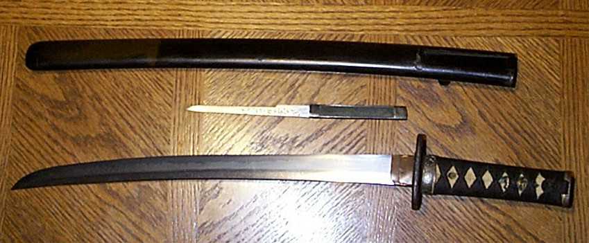 There is a kozuka (utility knife) in the saya! Most don't have them anymore. The kozuka appears to be heavily tarnished silver, with a new replacement blade.