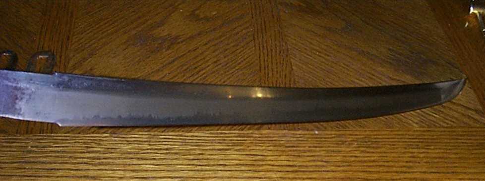 The blade is definately worth sending to a polisher. The hamon is visible all the way to the tip. The hamon changes from gentle gunome at the habaki to a wide notare in the center of the blade, and then changes to a wildly erupting chogi toward the tip, ending at the tip with a (kaen) or flame temper as seen in Yumoto pg 55.