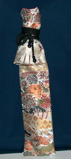 It is stored in a nice, silk, wakizashi bag made from a beautiful, old, Japanese Maru obi. Measures 6"x36" with base color of off white. Main design is of cranes (Japanese symbol of longevity), fans, Japanese house, plum blossoms, and many family mon (crests). Colors include red, orange, green, black, and gold. Full black lining. The bag is from Japanese Sword Bags.