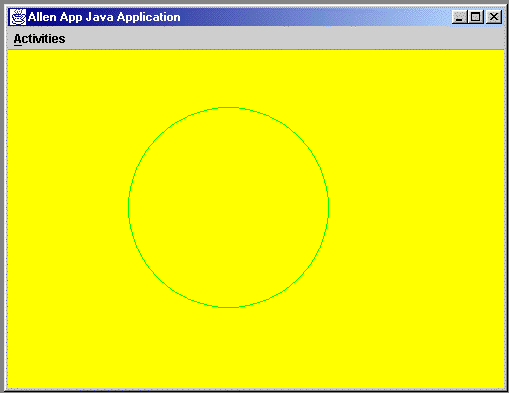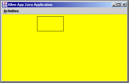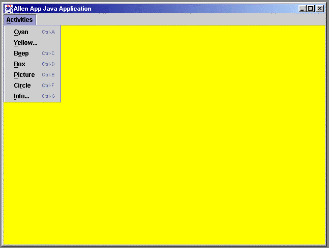 Note that none of the drawing in the window is permanent. If you cover the window in any way or cause it to repaint, everything in it is lost. If we wanted it to be permanent, we would attach a data structure such as an ArrayList to AllenApp. Then each of the menu items that draws something, such as Box, would instead just put a simple object into this ArrayList describing what should be drawn. The method called paint would then be overridden to read all of the objects in this ArrayList and draw something in the window accordingly. Since this would be done at every repaint, the picture would be permanent. You might like an erase option, however, to get rid of some or all of the objects in the ArrayList.