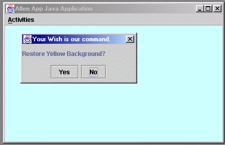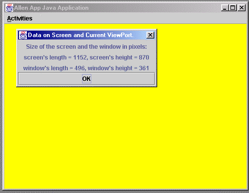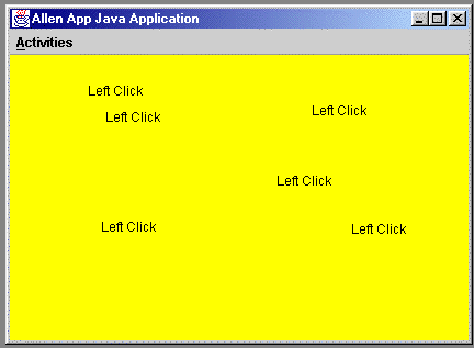 Instead of menu bars, we could have made activitiesMenu into a popup menu. The work would have been the same. The user could then pop the menu up by clicking in a special way (platform dependent-- control click on a Macintosh). The disadvantage of this is that it wouldn't be so easy to add key equivalents for our menu options. We would have had to create a key watcher, similar to our mouse watcher. I left some scaffolding for popup menus in the source code on the web site, but didn't print it in the paper.