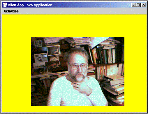 Finally, the start method of the AllenFrame class creates a new AllenFrame, which is a JFrame, of course, then creates a new AllenApp and initializes and starts the AllenApp. It then adds the AllenApp to the AllenFrame as one of its components. This component will be the main part of the frame, the window contents, as we shall see. We then pack the components of f, and give it a size equal to the size of the contained AllenApp. Then we set it to be visible.