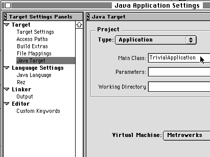 Select Java Target and change the name of the Main Class to whatever you have named it instead of TrivialApplication. You can also use this dialog to set additional options, such as whether the application class files are to be put into a Java archive or not, and which virtual machine to use to run the application. If you are working on a Windows machine, be sure to use the Sun JDK virtual machine, because the Microsoft version is incomplete.
