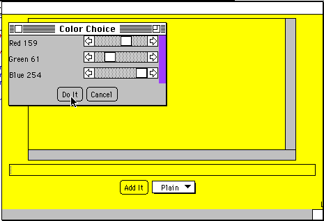 While I was working on this, I noticed in the third edition of Core Java (Core Java 1.1, Volume 1, Horstmann, and Cornell, Prentice-Hall, 1997), a nice control that set the RGB color of an item by using sliders, actually ScrollBars, to select the color values. I took the ideas there and created the following ColorSliderDialog, that can be used to ask the user to select the color of any component. Here is an example of how it looks embedded in an updated AllenApplet. Instead of typing numbers, the user just slides the controls. The numeric values in the labels are continuously updated as the sliders are moved and the small color patch at the right edge of the dialog updates to show the currently selected color. The Do It button is then used to set the background of its component, here the applet, to the selected color.