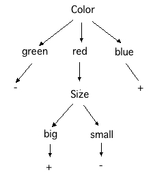 Max(.247, .914) = .914, so make size the attribute at this node. It's children are uniform in their classifications, so the final decision tree is: